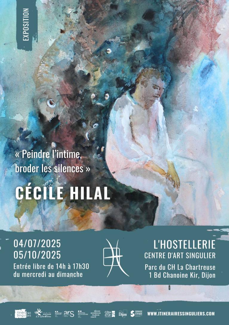 Cécile Hilal peint comme on rêve les yeux ouverts. Par la peinture et la broderie, elle fait émerger des récits intimes, des corps en métamorphose, des figures féminines et animales, entre mémoire, silence et réparation. Chaque œuvre est une traversée sensible où le geste devient soin, lien, présence. Son travail résume d’une pratique à la fois douce et puissante, où le pinceau et les fils racontent ce que les mots taisent. Diplômée de l’ENSAPC en 1992, elle expose en Europe avant de se tourner vers la scénographie et les projets collectifs. Après une longue pause, elle revient à la peinture en 2016, tout en s’engageant dans la médiation artistique auprès de femmes victimes de violences et de jeunes en exil. Aujourd’hui, elle poursuit un travail à la croisée de l’art et du soin, entre création personnelle et ateliers partagés.