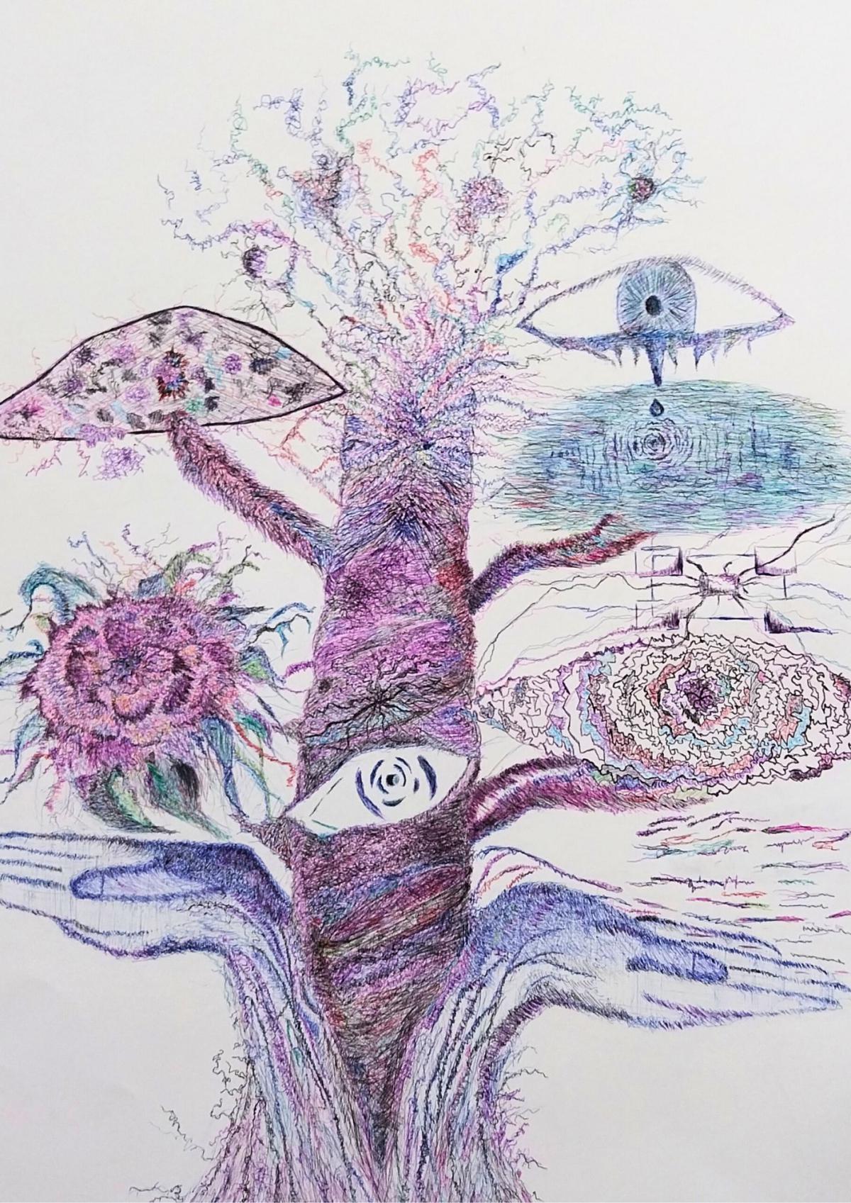 Née en 1992 à Langres, Emmanuelle Noble vit à la campagne entourée de sa famille, source essentielle de soutien et d’inspiration. Passionnée de dessin depuis son adolescence, elle a exploré la peinture, le pastel, le collage avant de se consacrer au stylo coloré, privilégiant le bleu, le violet et le rouge. Inspirée par ses émotions, ses recherches en ligne et l’univers fantastique, elle compose des œuvres précises et foisonnantes où se mêlent rêve et angoisse.