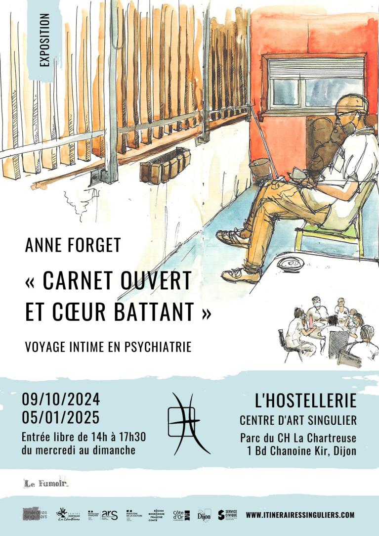 L’exposition propose un regard unique sur l’hospitalisation en psychiatrie à travers les yeux d’Anne Forget, ancienne patiente du CH La Chartreuse. Pendant son séjour en 2021, Anne a utilisé le dessin et l’aquarelle pour capturer des scènes de la vie quotidienne à l’hôpital. Ce carnet de voyage sensible et personnel retrace les moments forts de son hospitalisation, les interactions avec les soignants et les autres patients, ainsi que les émotions qui accompagnent cette expérience.