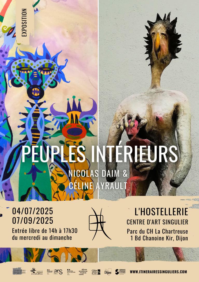 L’exposition vous invite à découvrir les œuvres de Céline Ayrault et Nicolas Daim, deux artistes qui explorent, chacun à leur manière, les mondes intimes qui nous traversent. Leurs créations donnent corps à ces peuples invisibles qui façonnent inconsciemment notre vie et notre histoire : émotions, souvenirs, rêves, peurs, pulsions, joies, élans, ferveurs...