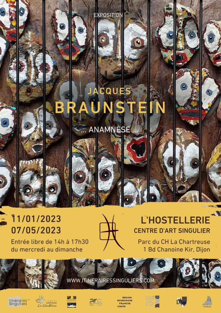 Artiste, plasticien, sculpteur, ancien directeur de l’Ecole Nationale des Beaux-Arts de Nancy, ancien président de l’Art en Marche (Centre d’art Singulier de Lapalisse), diplômé de l’école Boule, Jacques BRAUNSTEIN pose un regard humaniste sur notre monde et sa complexité, voire sa folie. Cette complexité confère une charge, un caractère magique à son œuvre plastique qui se joue de l’esthétisme pour parvenir au pathétique.