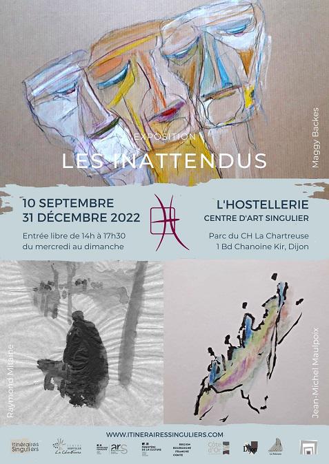 Exposition « Les Inattendus » : Trois espaces, trois artistes, trois surgissements, un triple mouvement de décentrement et d’orientation pour laisser une place à l’inattendu, thème de cette année 2022. Le décentrement impose un dépaysement majeur pour faire naître une vérité nue qui s’abandonne à une ouverture picturale intime et personnelle. L’orientation, elle, vise simplement à reconnaître ce qui est premier et primordial chez chacun d’entre nous. Les artistes ici présents interrogent donc l’acte de nécessité, un inattendu, voir un indicible qui vient des profondeurs et nous ramène à notre fragile humanité, à la part réelle et incommunicable de nous-même, à ce geste essentiel et primordial qui nous réunifie.